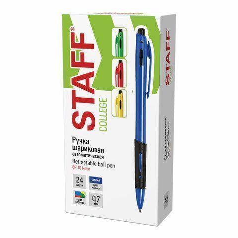 Ручка шариковая автоматическая с грипом STAFF College BP-16 Neon, СИНЯЯ, ассорти, 0,35 мм, 143750