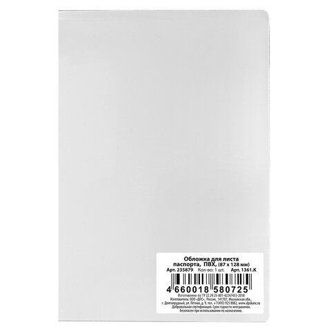 —Обложка для листа паспорта (для 1 листа паспорта), ПВХ, 87х128 мм, прозрачная, 1361, 1361