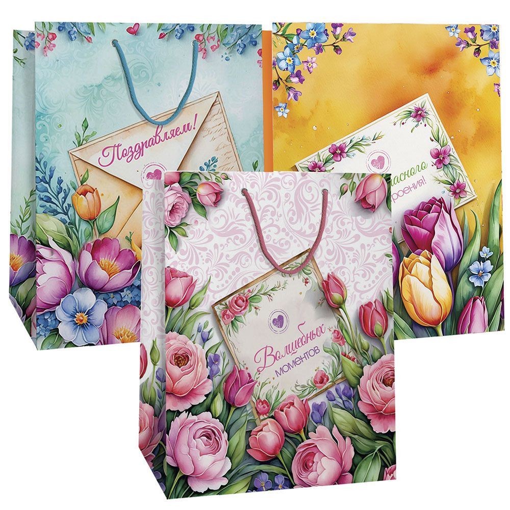 Пакет подарочный бумажный (18х23х10) ламинир Микс 3 дизайна 1/360 оптом и в розницу в Санкт-Петербурге, цены в каталоге с доставкой