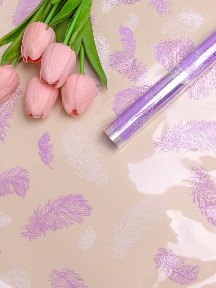 Ролик 60см х 8,5м пленка полипропилен Перышки белый/сиреневый 1/10