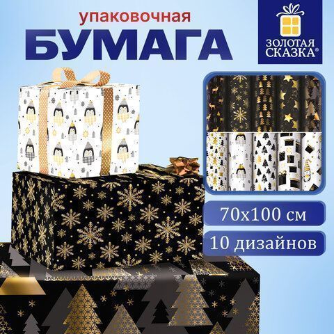 НГ Бумага упаковочная 70х100см ЗОЛОТАЯ СКАЗКА Black Gold White 10дизайнов 105г/м2 1/50